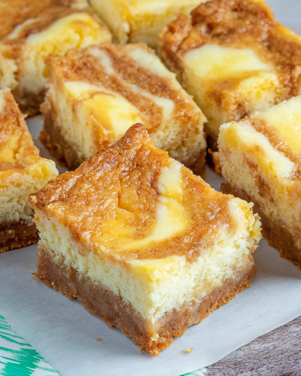 A layered dessert bar with a buttery crust, blender cheesecake filling, cinnamon roll swirl, and sweet glaze — baked into neat, sliceable squares.