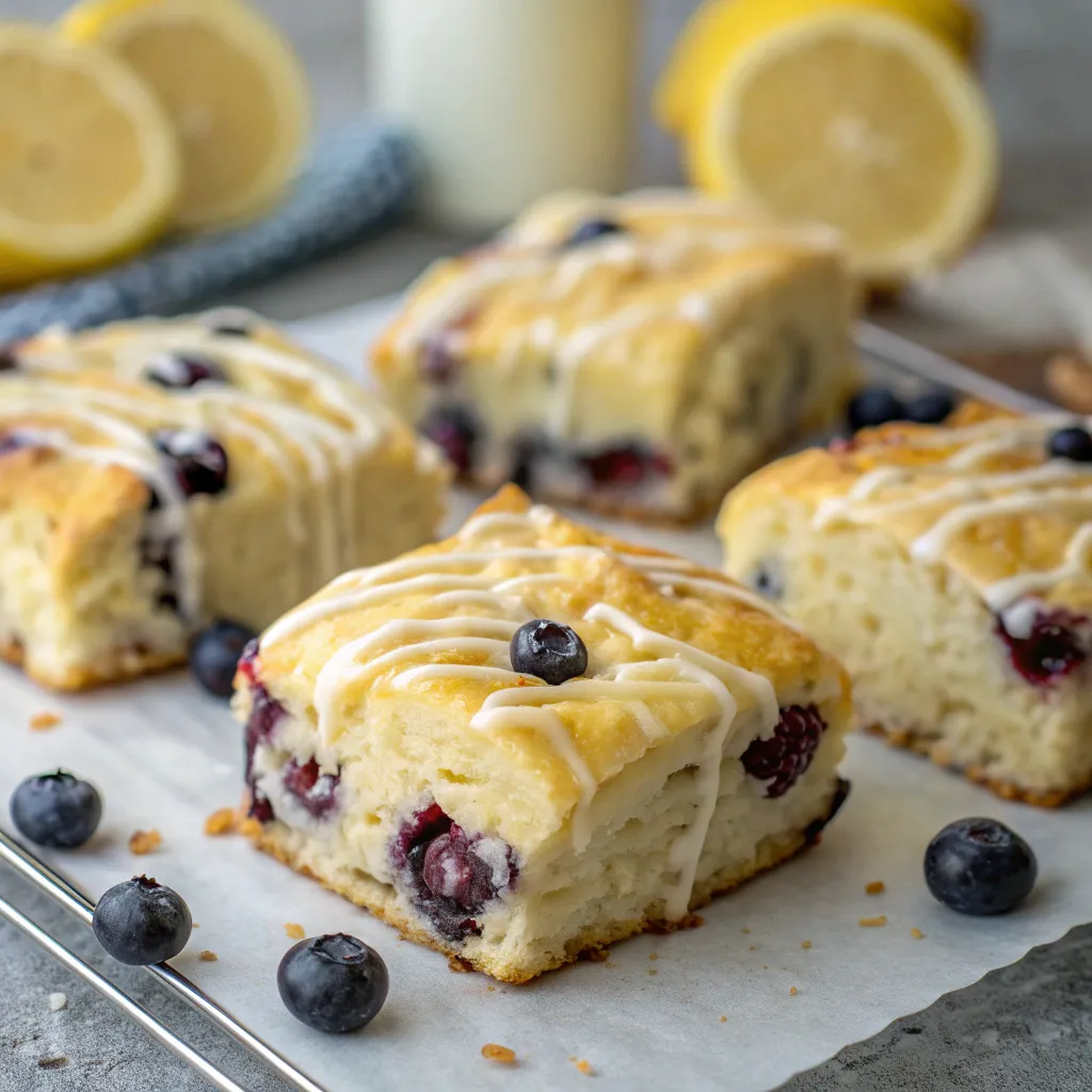 Golden, buttery biscuits bursting with blueberries and drizzled with sweet-tart lemon glaze.
