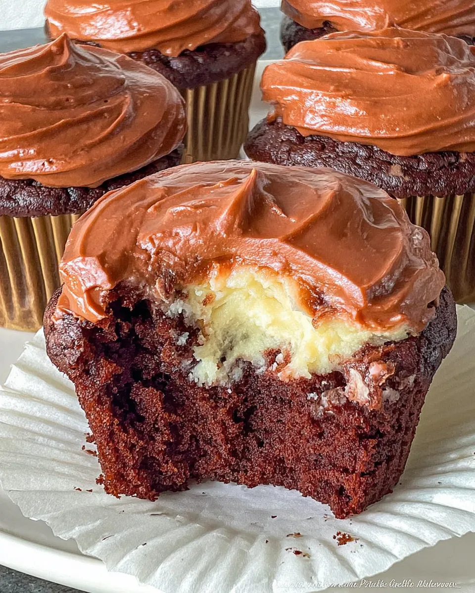 Moist chocolate cupcakes with a baked cream cheese filling and rich cocoa frosting.