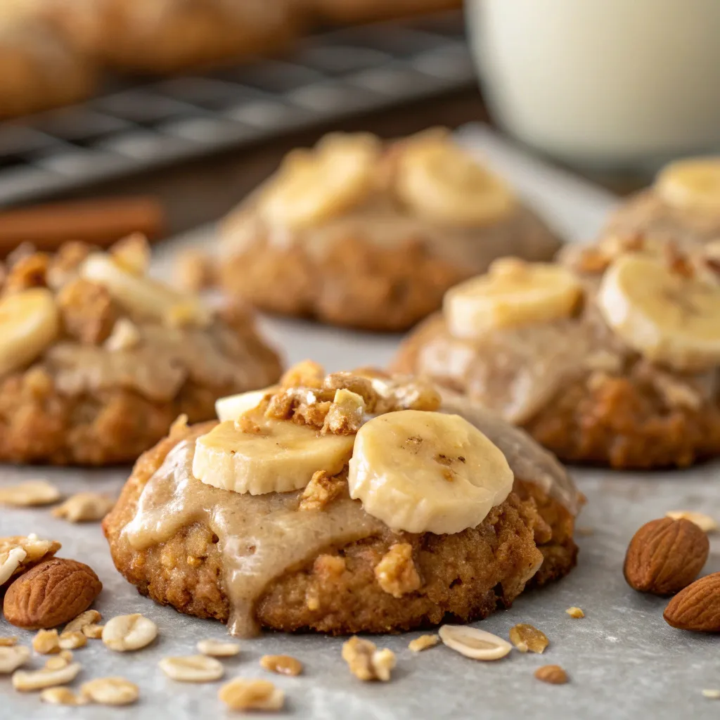 Soft, chewy, and perfectly spiced Cinnamon-Glazed Oatmeal Banana Nut Cookies that taste like banana bread in cookie form—topped with a warm cinnamon glaze.