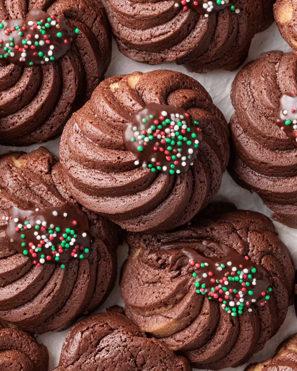 There’s something special about spritz cookies — their delicate shape, their buttery snap, and how effortlessly elegant they look on a plate. These Chocolate Spritz Cookies take that classic recipe and deepen it with cocoa, then finish it with a smooth chocolate coating and festive sprinkles.