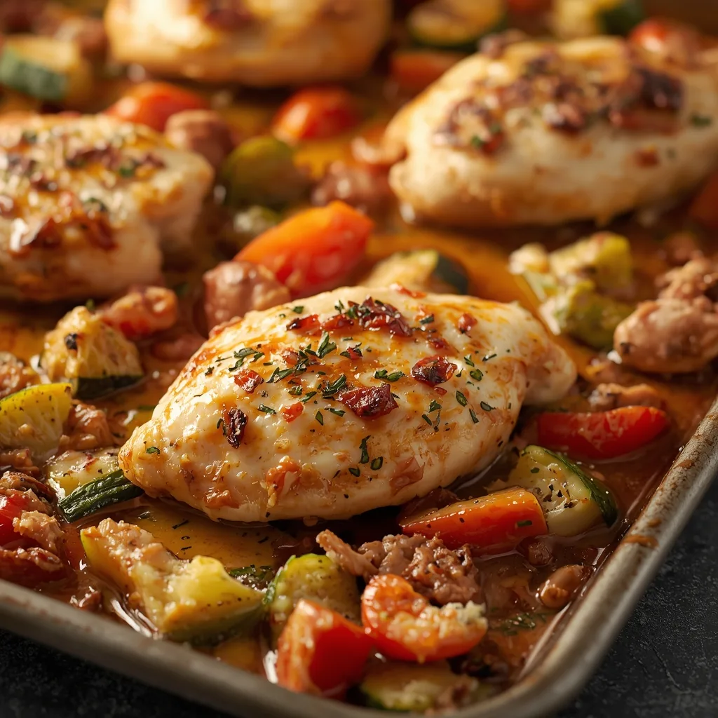 This recipe is a one-pan wonder: chicken breasts (or thighs, your choice) and a colorful pile of vegetables tossed with olive oil, garlic, herbs, and a splash of lemon — everything dumped on a sheet pan and baked until the edges are caramelized and the chicken is juicy. Serve it for weeknight dinners, casual Sunday suppers, or any time you want dinner that’s healthy, homey, and impossibly simple.