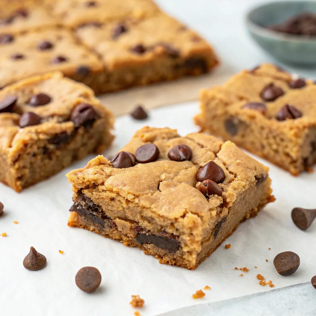 Healthy Greek Yogurt Peanut Butter Dark Chocolate Chip Cookie Bars with Crackled Tops