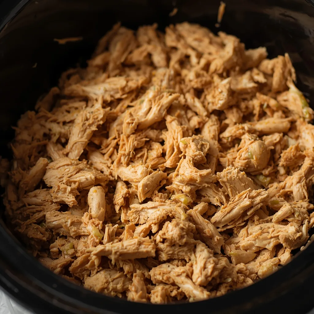 Remove the chicken to a cutting board. Use two forks to shred (or toss into a stand mixer for 30 seconds for fast shredding). Return shredded chicken to the slow cooker to soak up the juices for another 10–15 minutes. Taste and adjust — add a squeeze of lemon or lime, more salt, or a splash of vinegar if it needs brightness. The shredded bits should be moist, flavorful, and slightly glossy from the cooking juices.
