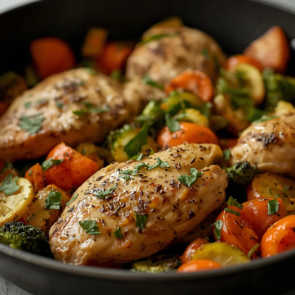 This one-pan concept is rooted in the timeless idea of balancing convenience with flavor. Roasting proteins with vegetables has been a staple across cuisines for centuries — think of Mediterranean sheet-pan dinners or northern European Sunday roasts. My version leans toward the bright Mediterranean vibe: lemon, rosemary, thyme, and olive oil. The citrus wakes up the rich chicken fat and brings a touch of summer nostalgia, even in the middle of winter. Personally, this was the recipe my college roommate taught me over a pan of lemon-roasted chicken after a terrible studio critique — food that comforts and calms, made with what you have.