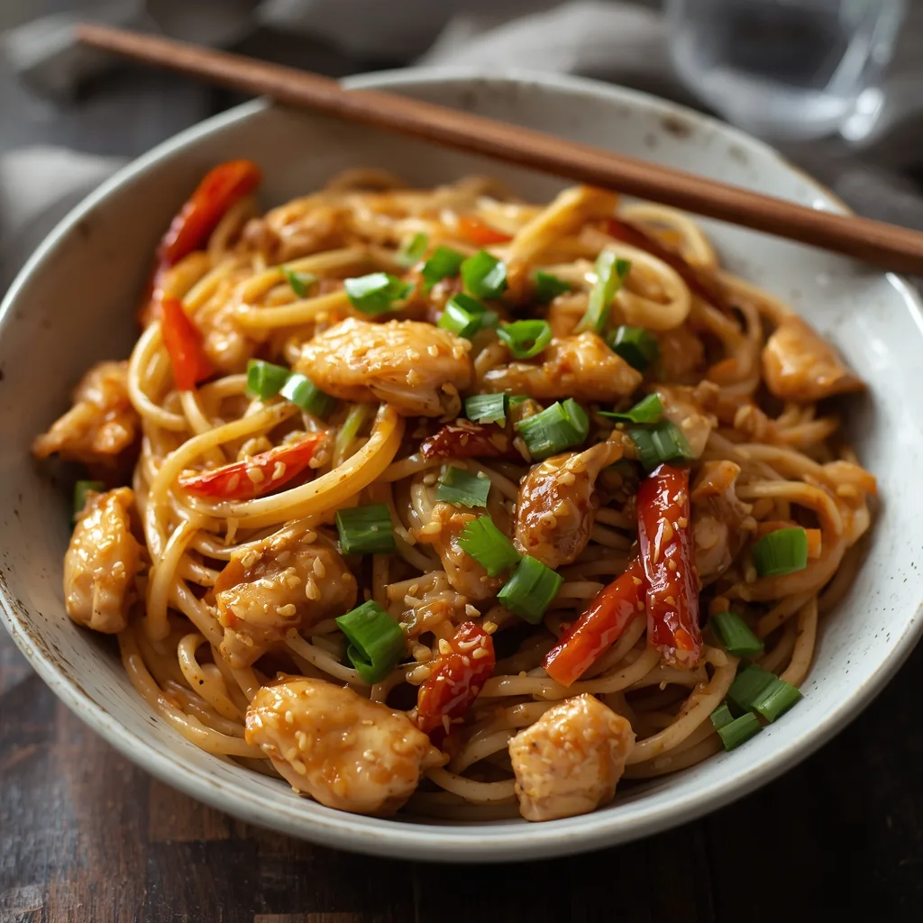 - Pour the sauce into the pan and let it come to a simmer. Return the chicken, then add the noodles. Use tongs to toss everything together, coating noodles and veggies with sauce. If the sauce seems thin, stir in the cornstarch slurry and cook until it thickens and becomes glossy — you’ll know it’s ready when the sauce clings to the noodles and shines. Finish with sliced green onion tops and a sprinkle of sesame seeds.