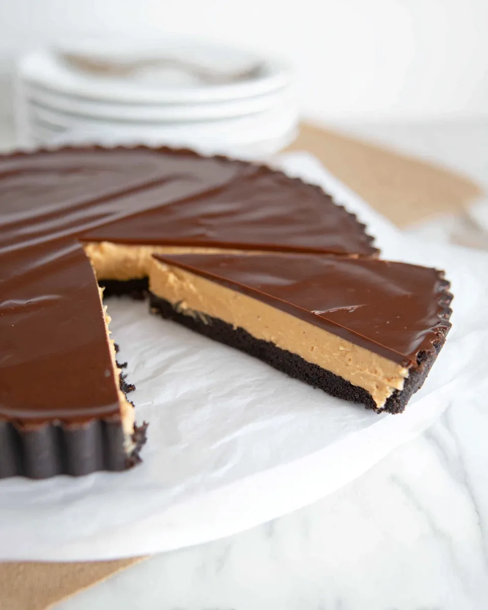 Deep chocolate brownie, creamy peanut butter center, and a smooth chocolate finish — basically a Reese’s dream in tart form.