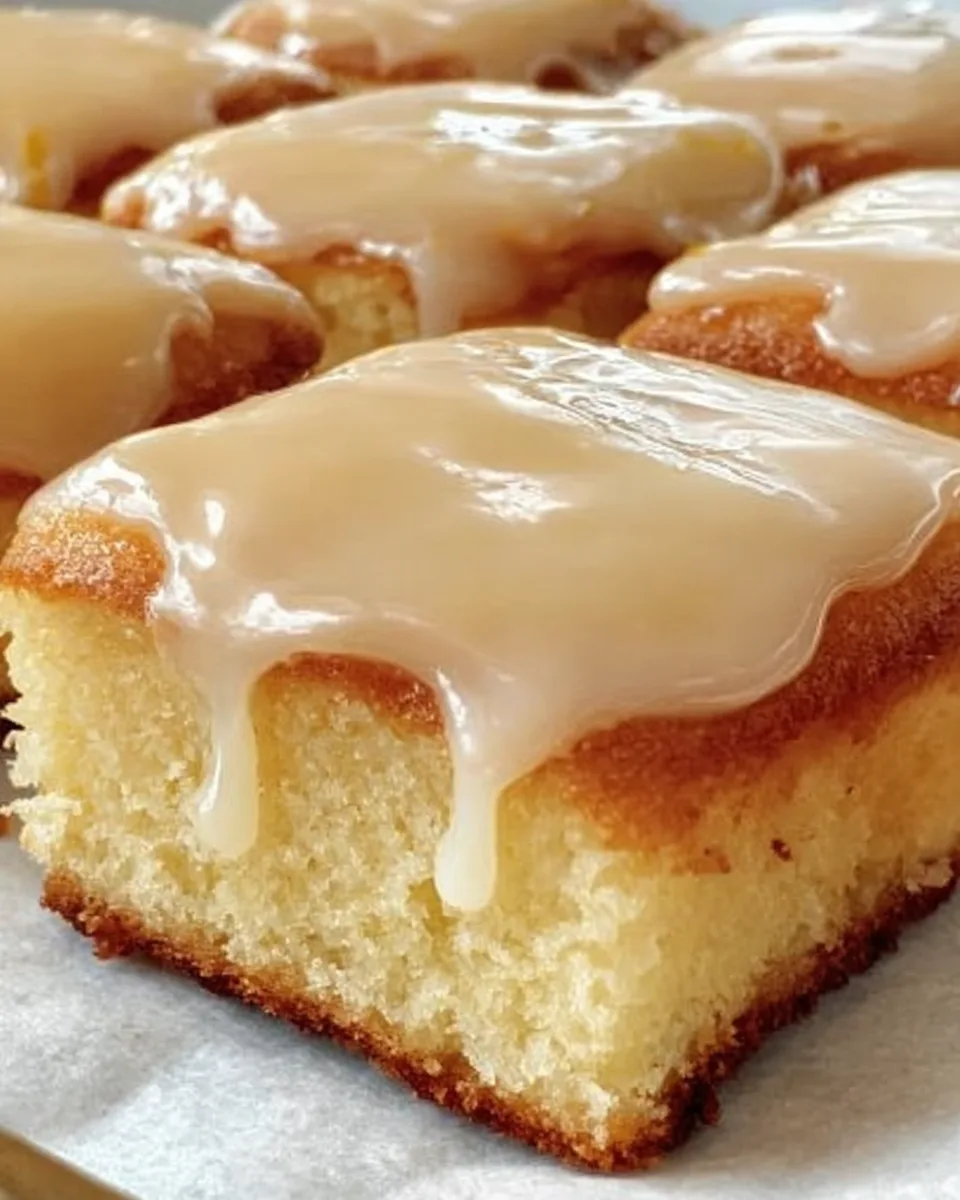 Soft vanilla donut cake baked in a square pan and finished with a smooth vanilla glaze.