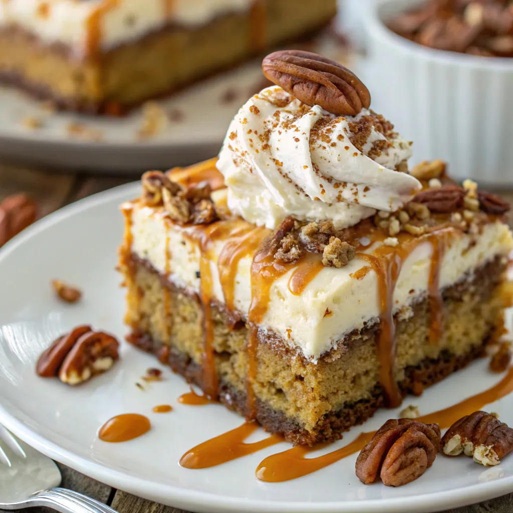 It’s a moist yellow cake made extra special with sweet mashed potatoes, warm spices, and a creamy caramel filling that soaks into every bite. Topped with fluffy whipped cream and crunchy pecans, this dessert is a showstopper for fall gatherings.
